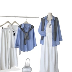 MILLAIDI 蓝色防晒衬衫+披肩+背心+松紧腰阔腿裤四件套秋韩系套装