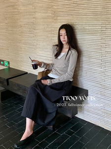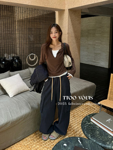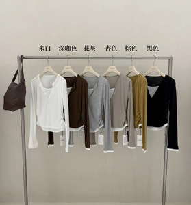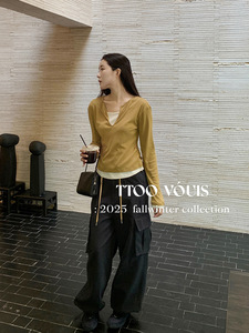TTOO VOUIS秋季新款5140抽褶收腰半开V领假两件防晒长袖T恤女薄