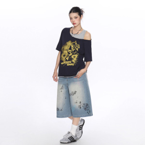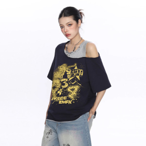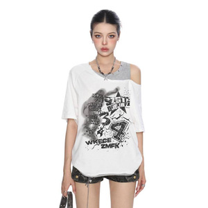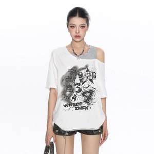 2025新款美式辣妹涂鸦印花假两件短袖t恤女夏季宽松白色露肩上衣