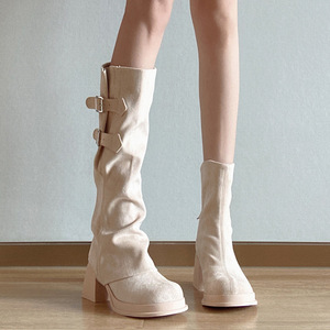 两穿可拆卸长筒靴女杏色圆头防水台粗跟皮带扣西部牛仔靴