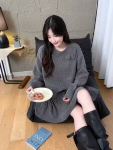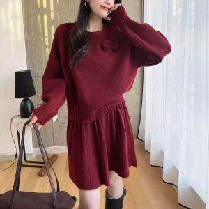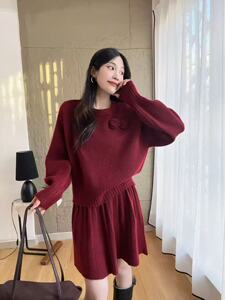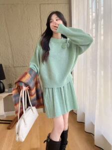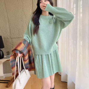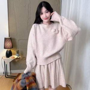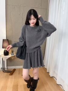 2025秋季圆领慵懒风针织毛衣套装百褶裙两件套花朵毛衣休闲套装女