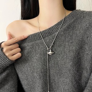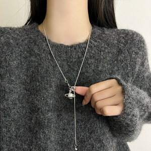 新款珍珠土星吊坠项链高级感抽拉可调节秋冬钛钢毛衣链配饰女