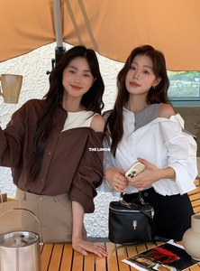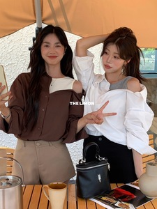 【高品质订货】4色微胖身材天菜条纹斜肩吊带拼接露肩假两件衬衫