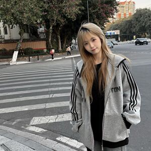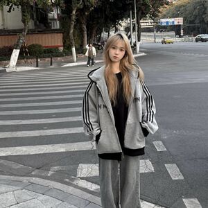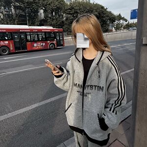 2025秋季新款通勤潮流印花字母撞色三条杠连帽卫衣外套