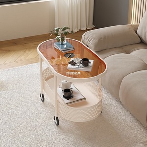 奶油风可移动茶几小户型客厅家用沙发边几桌带轮床头玻璃小推车