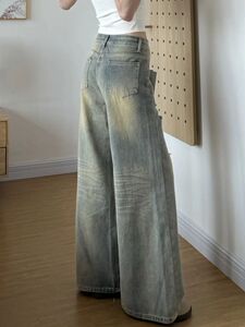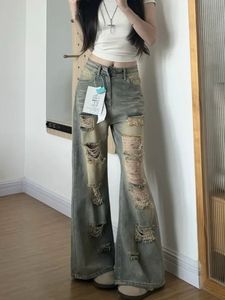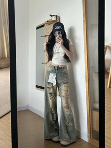 辣妹美式复古做旧破洞微喇牛仔裤女夏季高腰宽松显瘦阔腿裤拖地裤