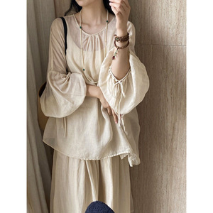 早秋 新中式国风苎麻女秋季薄款灯笼袖衬衫禅修