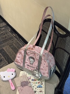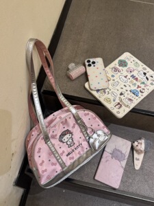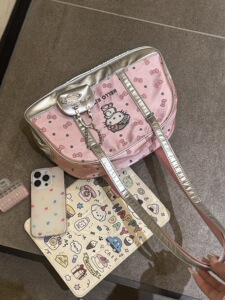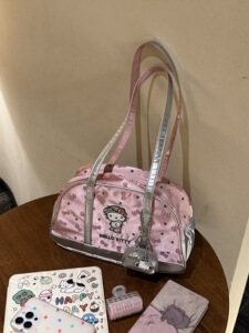 新款韩系ins银粉拼色kitty单肩包 甜美少女心大容量粉色手提包