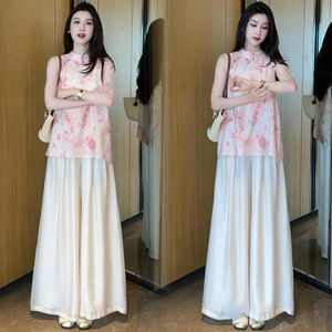 新中式时尚套装女夏季新款洋气显瘦国风印花无袖上衣阔腿裤两件套