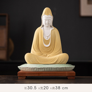 禅意观音【坐莲蓬】黄瓷+木脚座