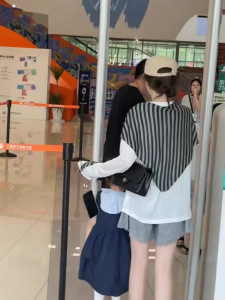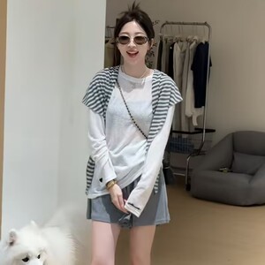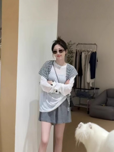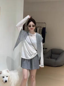 2025早秋套装新款慵懒宽松长袖T恤条纹披肩灰色休闲短裤三件套女