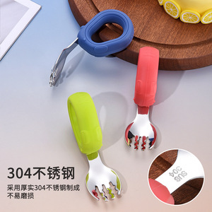 硅胶柄304不锈钢儿童训练餐具卡通弯头叉勺宝宝学吃饭辅食专用叉