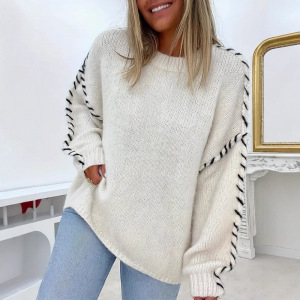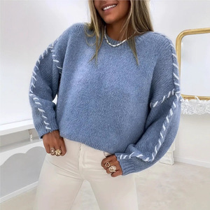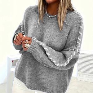 欧美跨境街头慵懒风毛衣女2025秋冬新款休闲拼色简约套头针织上衣