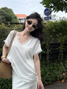 韩系绝美小套装宽松蕾丝边V领短袖T恤上衣高腰网纱拼接鱼尾半身裙