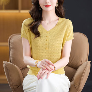 【厂家直供】V领纯色天丝短袖T恤女宽松短款夏季百搭针织冰丝衫潮
