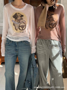 南油品质25SS秋新款圆领修身可爱卡通航海小狗印花长袖T恤女上衣