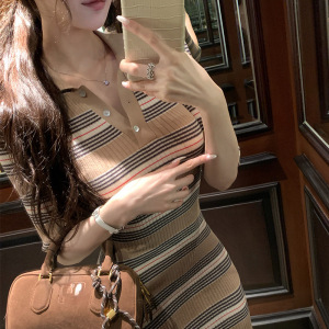 2025新款【摩卡棕】条纹翻领针织包臀裙女夏季收腰显瘦polo领洋装