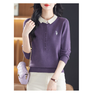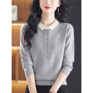 2025春秋装长袖毛衣T恤女polo领粉色针织衫洋气上衣妈妈打底小衫