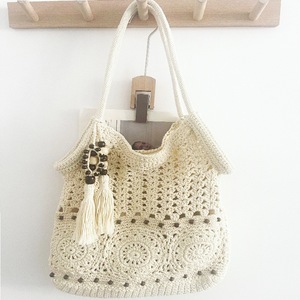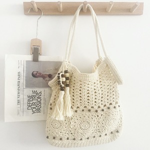 懒惰风单肩棉线编织包木珠流苏镂空大容量草编包度假风沙滩棉线包