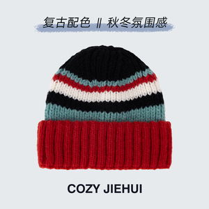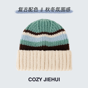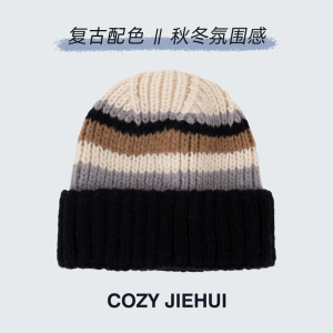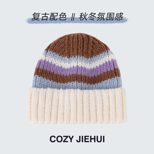 冬季女帽子高级感条纹针织帽百搭韩版显脸小秋冬复古毛线帽冷帽男