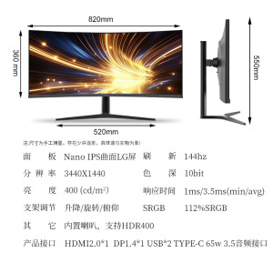 34英寸4K144HZ NANO IPS LG面板 DP HDMI Typec65w 反向充电