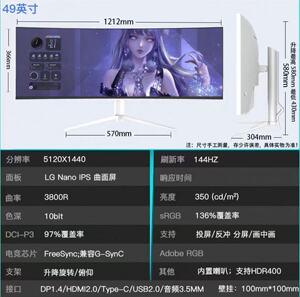 白壳 49寸带鱼屏5K144HZ 3800R曲率 带65W Typec 内置音响 LG面板原厂模组