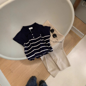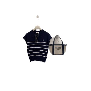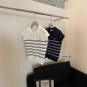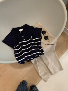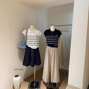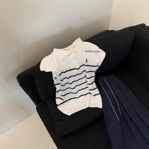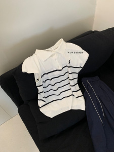WGWE 2025夏季极简主义复古polo领刺绣百搭条纹上衣针织衫女T恤