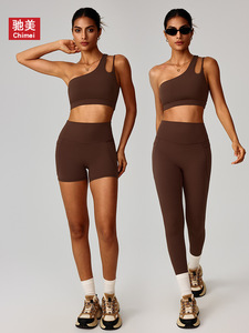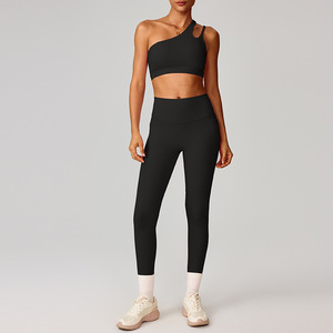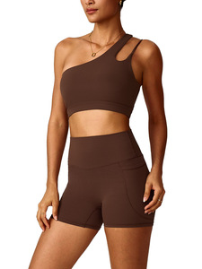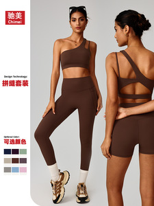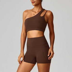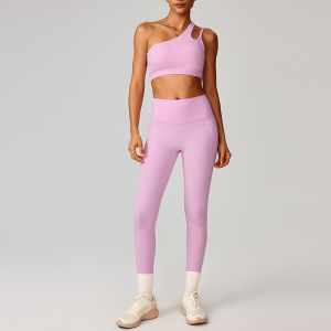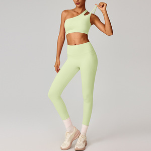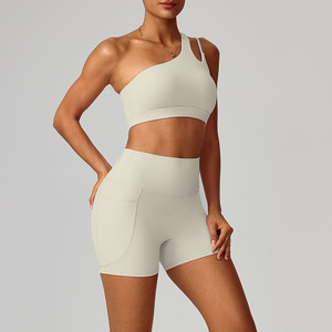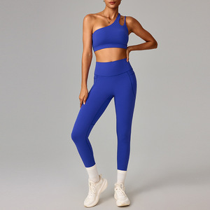 透气云感速干紧身瑜伽服跑步运动套装斜单肩文胸裸感健身裤带口袋