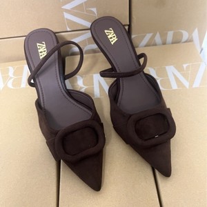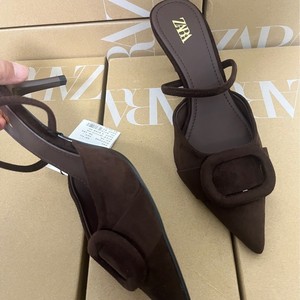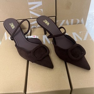 ZA西班牙2025夏季尖头女鞋时尚绒面方扣饰一字带高跟后空凉拖鞋女