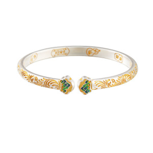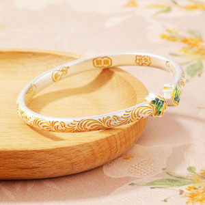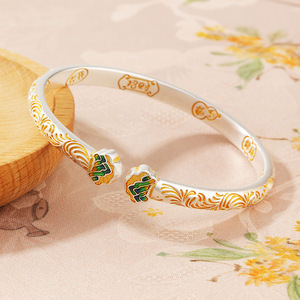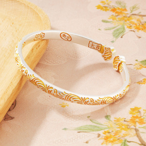 山盟唐草纹纯银手镯女足银9999描金实心开口银镯子新中式百搭送礼