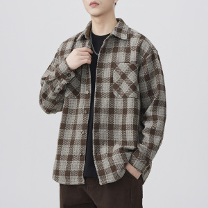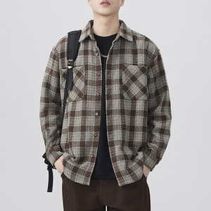 2025新款春秋款日系复古男士宽松衬衫磨毛格纹休闲美式衬衣外批发