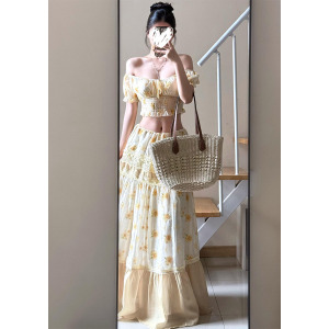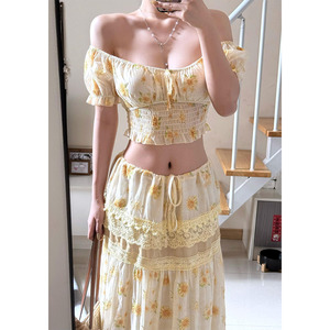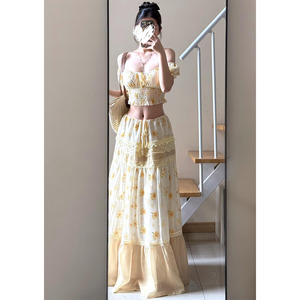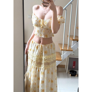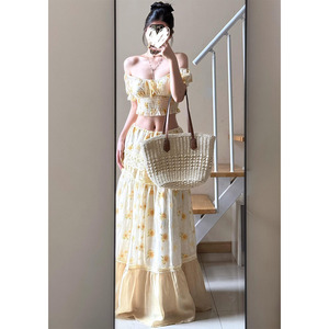 2025夏季海边度假多巴胺穿搭碎花抹胸一字肩上衣女半身长裙两件套