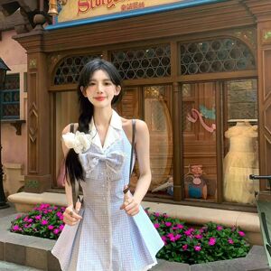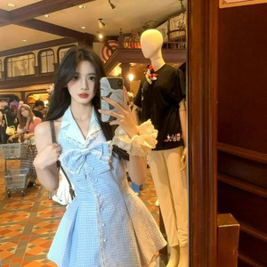 韩系减龄甜美蓝色格纹挂脖连衣裙小个子千金感气质收腰a字短裙子