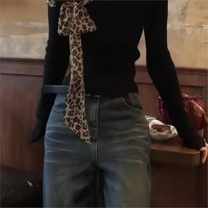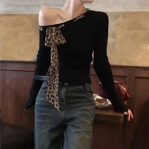 美式复古豹纹蝴蝶结斜肩长袖T恤女早秋辣妹修身显瘦内搭打底上衣