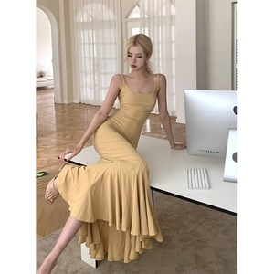 黄色包臀裙辣妹法式气质无袖吊带连衣裙女收腰显身材鱼尾裙中长裙