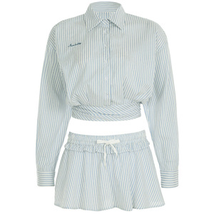 美式休闲女装条纹长袖衬衫新款简约高腰系带A型伞裙套装两件套秋