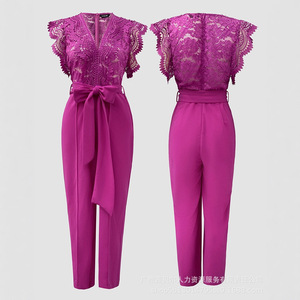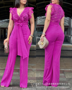 ODL2457亚马逊新款欧美蕾丝拼接系带阔腿连体裤