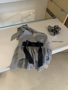 WGWE夏季女韩系纯欲风条纹多层荷叶边蝴蝶结挂脖V领上衣小衫W6564
