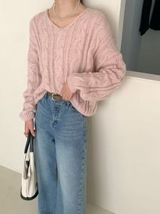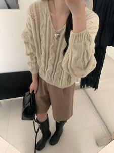 日系复古V领麻花套头毛衣女2025秋冬新款休闲宽松短款针织衫上衣