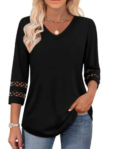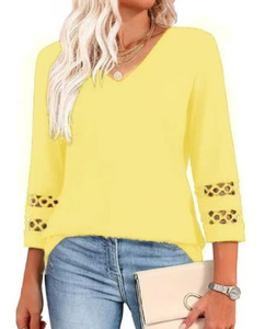 2025新款欧美跨境女装时尚宽松V领七分袖休闲镂空上衣纯色T恤女
