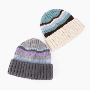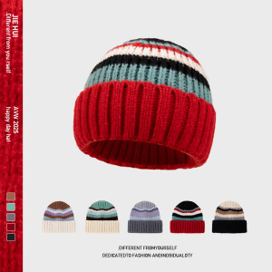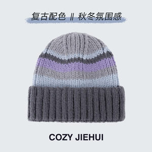 秋冬新款彩色条纹针织帽韩版百搭显脸小复古毛线帽男女款百搭冷帽