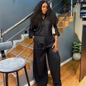 欧美女装高级感炸街减龄黑色翻领衬衫阔腿裤女非洲宽松大码两件套