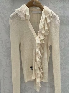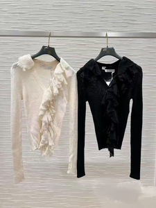 明星同款小蜜蜂刺绣荷叶边V领长袖针织衫女早秋季气质设计感上衣