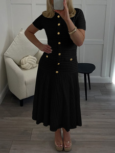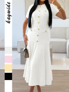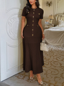 迪芸欧美简约优雅风纽扣短袖长裙连衣裙女装2025秋冬亚马逊独立站