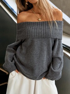 亚马逊2025欧美毛衣女秋冬季女装新款一字肩露肩纯色宽松女式毛衣