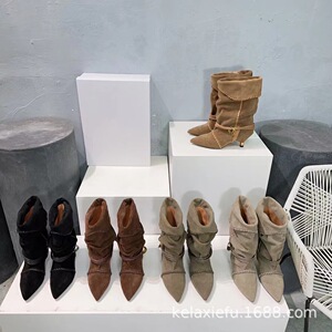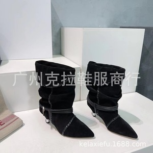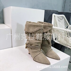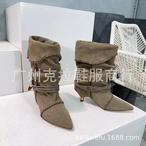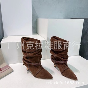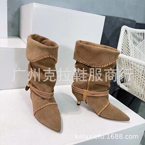 高定2025磨砂牛麂皮尖头西部牛仔靴女复古增高绑带褶皱中筒堆堆靴