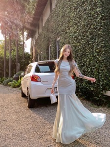 2025新款法式绿色一字肩露肩针织连衣裙子女海边度假收腰气质长裙
