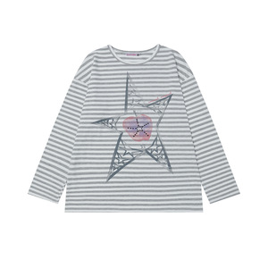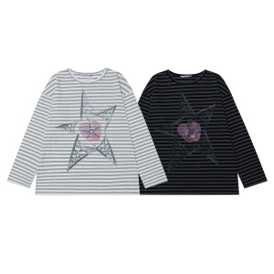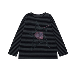 T1027高级感潮流美式女潮条纹宽松长款街潮五角星印花设计长袖T恤