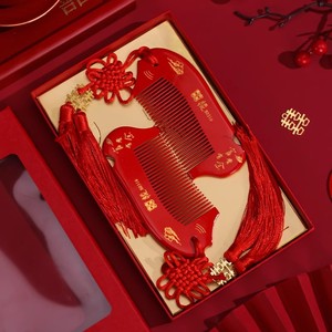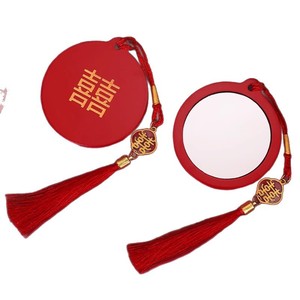 结婚喜字小圆镜女方陪嫁用品大全婚礼高档迷你实木化妆镜梳子一对