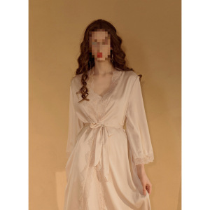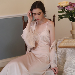 高级感冰丝绸长款睡裙女夏法式复古薄款仿真丝吊带裙睡袍套装春秋